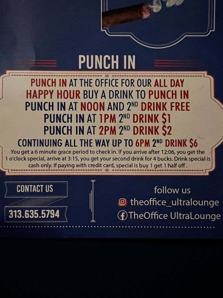 The Office Bar offers amenities such as Happy Hour, Accepts Contactless Payments, ensuring a comfortable and convenient experience for clients.